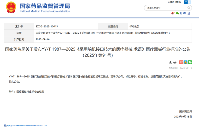 2025年9月15日,国家药监局正式发布了中国首个脑机接口医疗器械行业标准——YY/T 1987—2025《采用脑机接口技术的医疗器械 术语》。该标准将于2026年1月1日全面实施,系统性地构建了涵盖基本概念、范式类型等在内的术语体系,有效填补了行业“无标可依”的空白,为脑机接口医疗产业的规范化发展奠定了坚实基础。