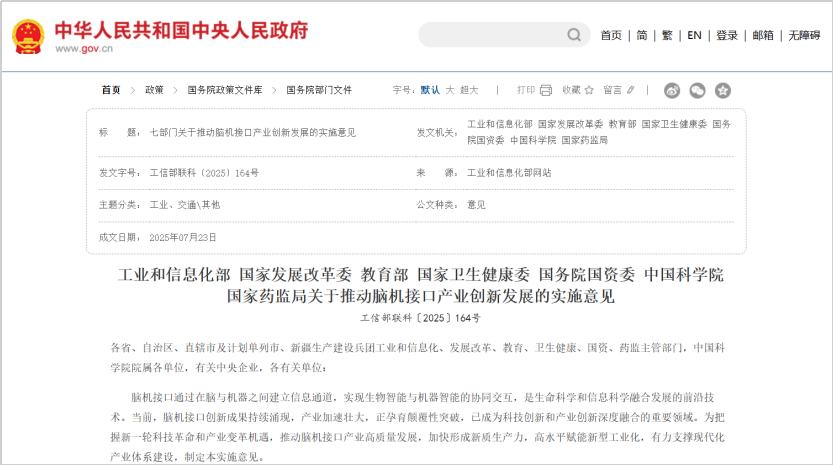 2025年7月底,工信部等七部门联合印发的《关于推动脑机接口产业创新发展的实施意见》,首次从国家战略高度确立了非植入式脑机接口的发展方向。政策明确提出要加快产业化进程,推动设备向更轻便、更高效、更低耗能的方向迭代,同时拓展医疗健康和生活消费应用场景。这为产业发展描绘了清晰蓝图: