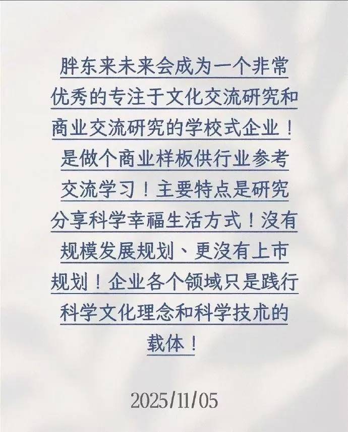 11月5日,胖东来创始人于东来在社交平台发布图文明确回应市场关切:胖东来没有规模发展规划,更没有上市规划。